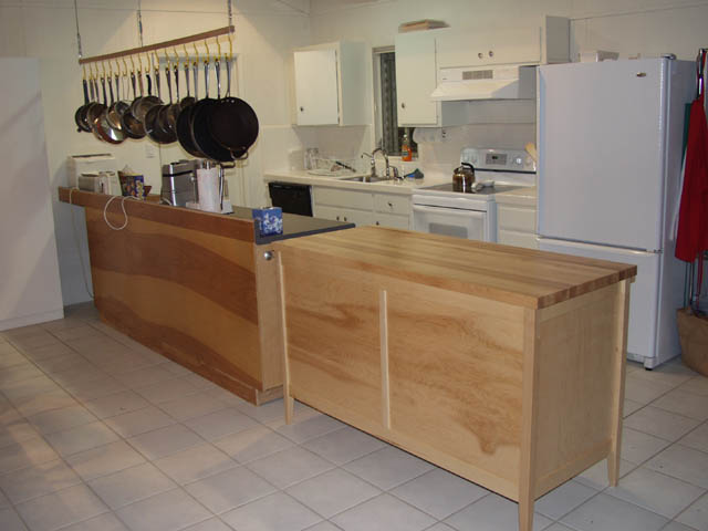 Here is the kitchen with both the cabinet and the maple table lined up across from the original kitchen. I've added 15 feet of work space to the 1.5 feet of prep area that was in the original. I've just finished the table and am slowly moving into the drawers. I'd like to keep the top empty so I can use it for plating dishes when I have dinner parties. Of course, nature abhors an empty horizontal surface...