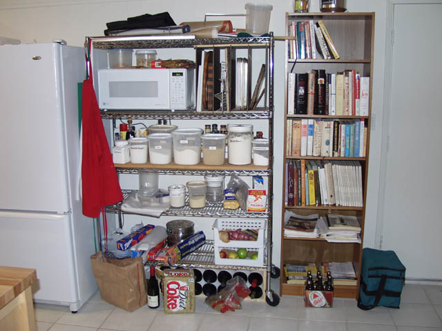 This was a prefab garage cabinet. It was pretty flimsy, with the shelves supported only at the side edges. I knew I was planning to have china and canned goods, so I re-engineer the cabinet as I was assembling it and support the shelves at two place in the back as well (you can see the 1 x 4 boards that I added.