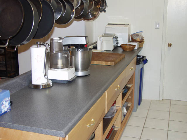 My second project as I moved in (the first was the new electrical circuits) was to make a cabinet to go opposite the existing kitchen cabinetry. I made an 8 foot wide cabinet with three deep drawers and six full extension pull out shelves. I bought a pre-formed formica top 10 feet long at Home Depot and put on top. I figure I'll use the cabinet, but perhaps not the top, in my workshop in Ashland.