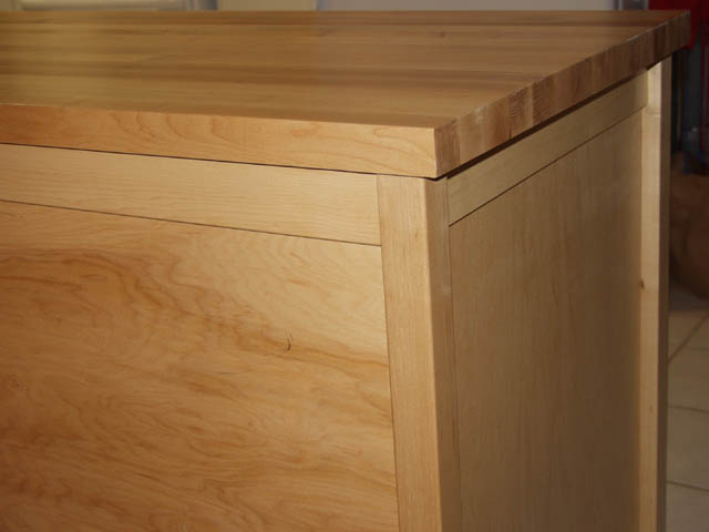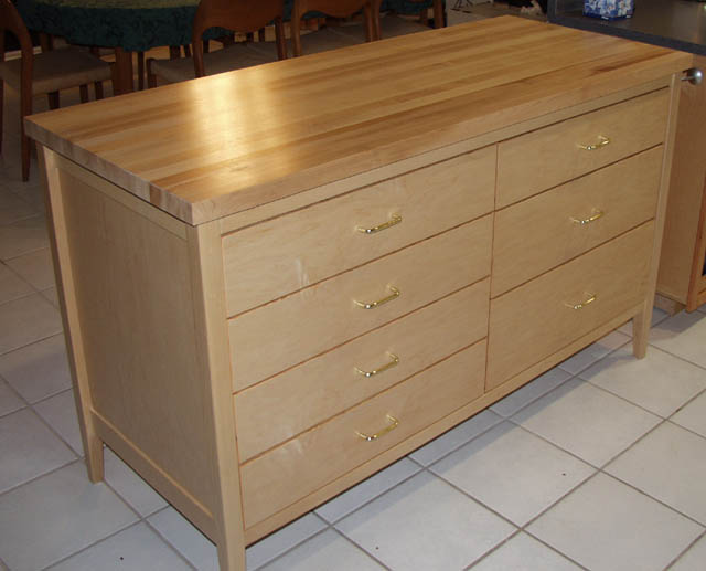 My latest project is a kitchen work table. I purchased the maple top (25 by 60 inches) and made a base for it out of maple and maple veneer plywood. There are seven drawers, which are all full extension and have brass wire pulls. It took almost three weeks to make, but I'm very pleased with how it turned out.