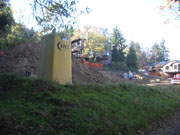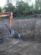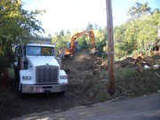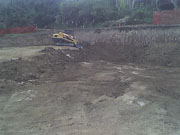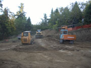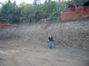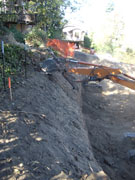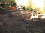 10/18/05 By the end of the second day, they had moved a lot of dirt, but there was lots more to go. The cut on the uphill side shown in the first picture will be around 12 feet deep before the footings go in. The orange fence is protecting a walnut tree on our neighbor's property.