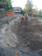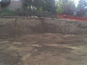 10/21/05 Day five was more digging. The soils engineer called for sloping the ground for all but the last 6 feet. He let the ground around the tree be a little more vertical. As you can see, the hole is getting pretty deep. They are also starting to pile some dirt on the back of the lot since they are going to need a lot to backfill the foundation.