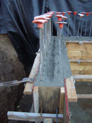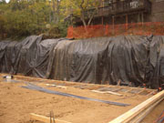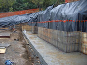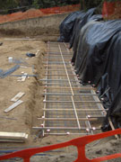 10/31/05 They finished making and bracing the forms for the first section of wall, had them inspected, and poured them. There are a couple of interesting things to notice in the closeup picture. They made a groove in the middle (probably with a 2x4) so that the next section of wall will make a stronger bond to the first section. Also, you can see on the side a turnbuckle on the end of the brace which can be used to tweak the vertical positioning for plumb. After the forms come off, they will waterproof the outside, wait a few days for the concrete to reach full strength, and back fill with pea gravel.