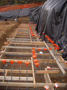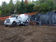 10/27/05 The concrete truck was there at 7:30 AM to pour the footing. It took a total of 31 cubic yards (around 45 tons) to fill this footing. That was 3-1/2 truckfulls. This was a quick setting mix. By the end of the day, they were able to remove the forms. Tomorrow the forms start going in for the wall (at least the first 4 feet thereof). The OSHA guy is also coming by. Let's hope he will be reasonable.