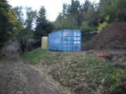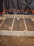 10/26/05 Good news on the OSHA front. Robert got the soils engineer to agree that we didn't need to shore up the wall if we poured it in 4 foot lifts. This means that it will take 3 pours to get the full height of the wall (the last pour can be more than 4 feet in places), but it will save money and lots of hassle. We will need to waterproof and back-fill between pours (which means waiting for about a week between pours for the concrete to reach sufficient strength to back-fill). From a strength standpoint, a single pour would be better, but there is no way that it could be done here. Today our forms got a lot more rebar and we now have a storage container (as well as electricity). The plumber came by to install 2" drains for the light wells, which will run through the footing. The plan is to pour the footing first thing tomorrow morning.