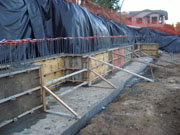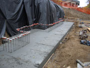 10/30/05 Things went well with the OSHA guy because we had the letter from the soils engineer. It took all of Friday to clean up the footing and get in half of the form for the first 4 feet of the wall. The crew came back on Saturday and almost finished up the form. The plan is to pour this wall on Monday. It's not clear how much else is going to be done at the site until after this entire wall is in and back filled. It seems to me that there are things that could be done in parallel