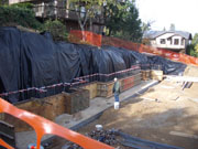 10/25/05 Well, the soils engineer was a bit surprised by the height of the cut. He had some suggestions. One was to cover the wall with fabric to protect it from rain and protect those below from falling things. They also formed up for the footing. It is wider than I had expected, and has lots of good sized rebar in it. The hope is to get it inspected and get it poured by Thursday. Once this wall is built and back-filled, life gets much easier.