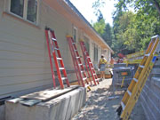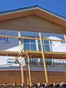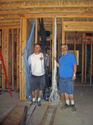 Andy and Jen (and Enzo) came up for a long weekend. In 2-1/2 days, Dick and Andy pulled around 7000 feet of wire. They did all of the low voltage wiring, including telephones, computer network, coax for video, control and power wiring for speakers in a number of places (7 rooms and the back patio, each with individual volume control and source selection). Most wires are home runs to the mechanical room in the basement. The audio wiring is home runs to the living room next to the fireplace, where the sound system will live.