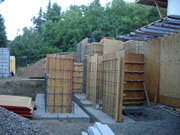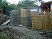 On the outside, there is siding on the uphill (west) side of the house and trim around quite a few of the windows. The back patio retaining wall slowed down because the electricians had to install cans for lighting of the steps and the plumbers had to put in sleeves for getting gas to Dick's grill and to the greenhouse for heating. There is an amazing amount of steel in the retaining wall. This is one patio that isn't going anywhere. I understand that the concrete guys are coming back this week.
