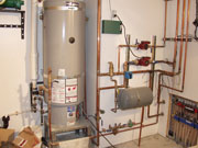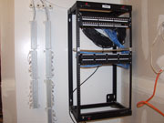 A lot has happened in the mechanical room. The water heater / boiler has been in for a while. The radiant heat in all the floors has been running for several weeks. It was really helpful for getting the sheetrock "mud" to dry. It's been running open loop since the thermostats haven't been installed yet. Dick got all of the low voltage wires terminated. That includes coax for TV or FM, Cat5 for computer networks and telephone wiring.