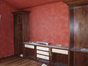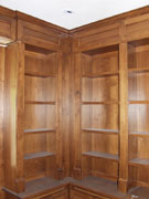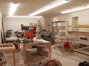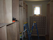 The master closet is a work-in-progress. Dick decided to make the insides himself. The cabinets will eventually be stained darker and clear coated. You can see the shoe rack under the window. It will start out less than full. Dick has taken over a corner of the workshop. On the chrome shelves you can see the dovetailed sides for some of the drawers that will be going into the closet.