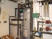 I had to show you a couple of pictures of the mechanical room. The air handler is installed, along with an air-to-air heat exchanger for getting fresh air without losing your heat/cool. In the plumbing picture, you can see the filter for the icemaker, instant-hot, pot filler, etc. In the foreground of the air handler picture is the compressor for the wine cooler. It is on a rack that will also house the compressors for the two commercial reachins in the kitchen.
