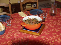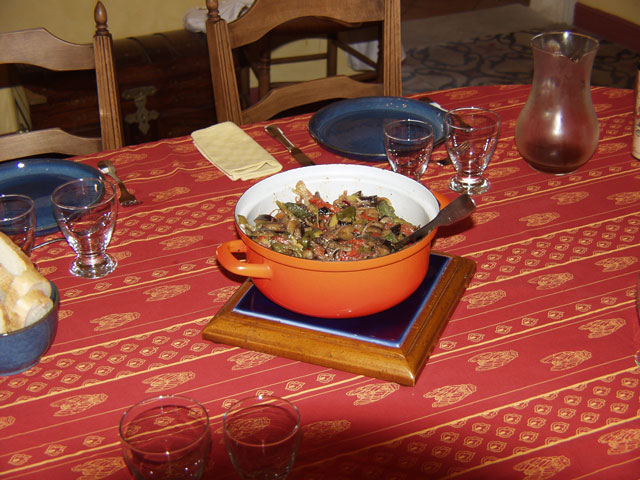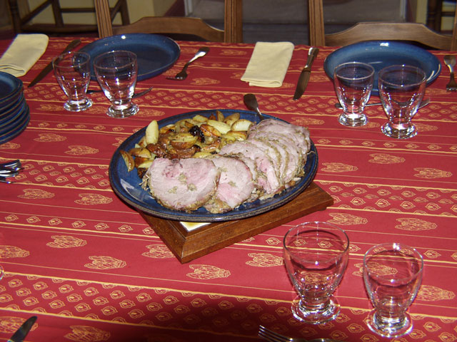 That night we went back to our Bonnieux hotel and fixed dinner. The prep work for the dinner was done in our morning cooking class with Sharon and Elaine. We had pork loin with green teppenade stuffing.